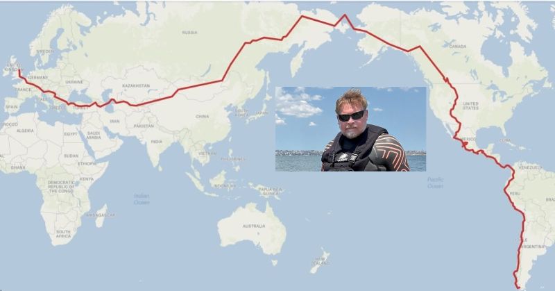 Análisis del mapamundi: La particularidad de este mapamundi es que su protagonista, el exparacaidista inglés Karl Bushby, que sirvió 11 años en el Ejército británico, se propuso realizar una vuelta al mundo a pie, sin utilizar ningún medio de transporte, ni aviones, ni barcos, ni autos, ni trenes; solo sus pies. Pero ¿Cómo cruzó el estrecho de Bering? Esperó al invierno, cuando las aguas se helaron y lo atravesó a pie en compañía de otro aventurero, lo que les tomó 14 días en recorrer a pie unos 240 kilómetros.