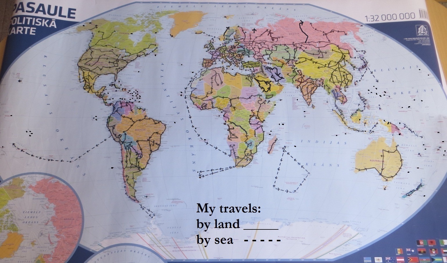 Mapamundi señalando todos mis viajes por tierra y por mar, sin aviones, pues volar es como hacer trampas. El verdadero viajero viaja a lo Marco Polo, por tierra y por mar, y solo utiliza el avión cuando no hay otro remedio.